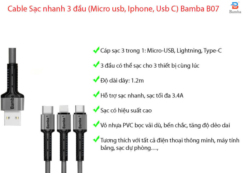 Thời gian bảo hành: 12 tháng Lỗi 1 đổi 1 Cáp sạc Sạc nhanh 3 đầu (Micro usb, Iphone, Usb C) Bamba B07 với thiết kế đặc biệt 3 trong 1 (MicroUSB, lightning, type C) cho khả năng sạc cùng lúc 3 thiết bị mà vẫn đảm bảo được đầu ra ổn định và nhanh chóng. Dây cáp sạc giúp sạc vượt trội và hạn chế tối đa được việc quá tải, quá áp và không gây cháy nổ khi sử dụng.