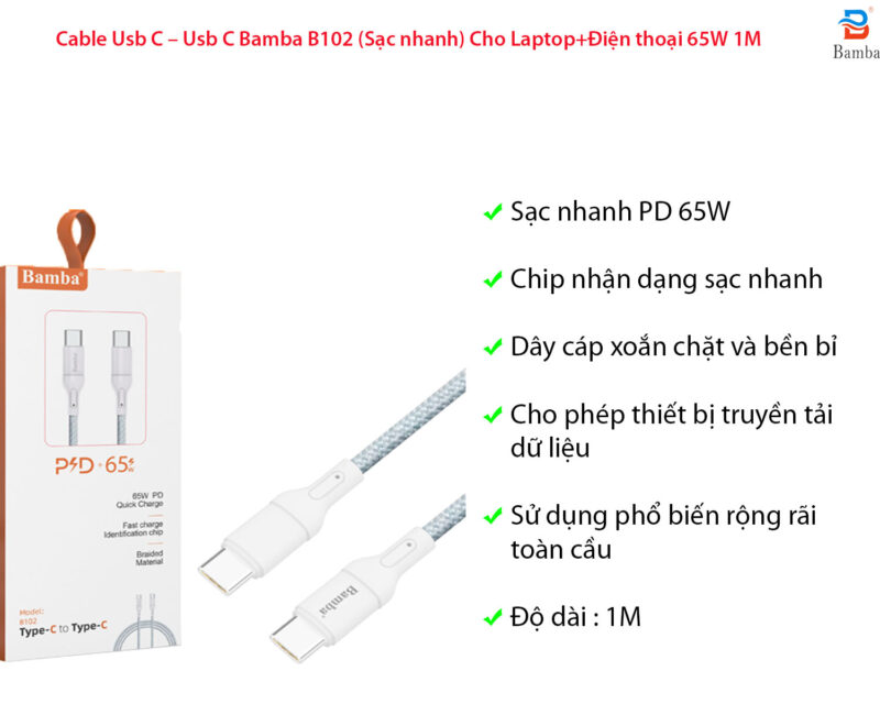 Thời gian bảo hành: 12 tháng Lỗi 1 đổi 1 Cáp sạc Usb-C – Usb-C sử dụng bộ chip điều khiển vi mạch chất lượng cao , thiết kế nhỏ gọn , là sự lựa chọn hoàn hảo khi dùng ở nhà và di chuyển bên ngoài . Sản phẩm thích hợp hầu hết các điện thoại có cổng sạc Type-C