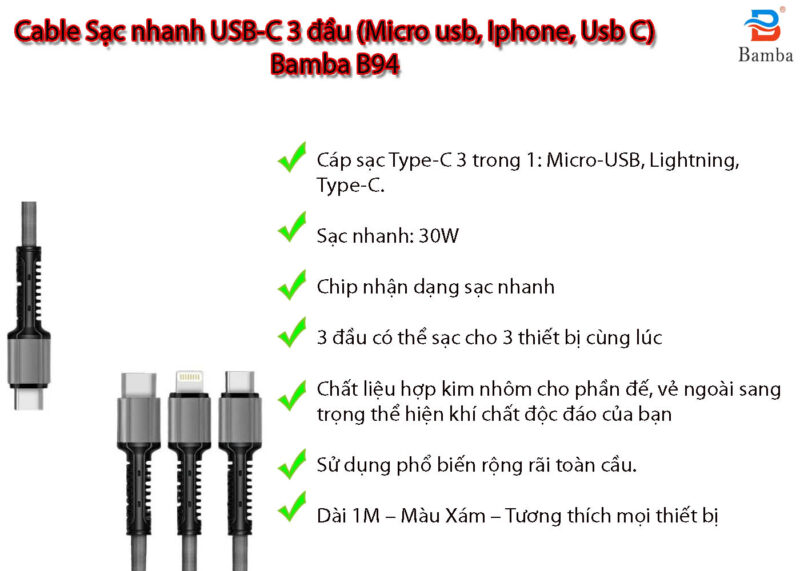 Thời gian bảo hành: 12 tháng Lỗi 1 đổi 1 Cáp sạc Sạc nhanh 3 đầu (Micro usb, Iphone, Usb C) Bamba B94 với thiết kế đặc biệt 3 trong 1 (MicroUSB, lightning, type C) cho khả năng sạc cùng lúc 3 thiết bị mà vẫn đảm bảo được đầu ra ổn định và nhanh chóng. Dây cáp sạc giúp sạc vượt trội và hạn chế tối đa được việc quá tải, quá áp và không gây cháy nổ khi sử dụng.