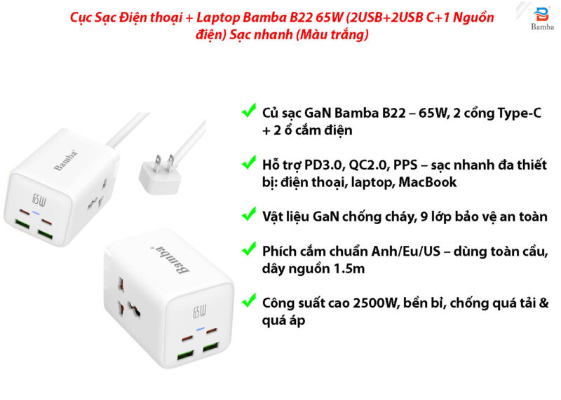 Thời gian bảo hành: 12 tháng Lỗi 1 đổi 1 • Thương hiệu: Bamba • Model: B22 -Màu sắc : Trắng , đen -Độ dài cáp : 1.5M – 2 Cổng Usb C + 2 Cổng Usb-A + 2 lỗ cắm điện Max 65W – Điện áp vào : AC250V 50/60Hz – Nguồn vào USB : AC100-240V 50/60Hz 1.5A Max – Định mức dòng điện : 10A Tối Đa – Nguồn ra AC : 250v 2500W – Nguồn ra DC : TypeC1/2: 5V-3A , 9V-3A , 12V-3A , 15V-3A , 20V-3.25A – PPS: 3.3-21V-3A 65W Max – Usb-A1/2 : 5V-3A , 9V-2A , 12V-1.5A 18W Max – TypeC1+TypeC2= 45W+20W – Usb-A1+Usb-A2 = 5V-3A – TypeC1+Usb-A1/2 = 45W+ 18W – TypeC1 ( Usb-A1+Usb-A2 ) = 45W + 15W – TypeC2 ( Usb-A1+Usb-A2 ) = 45W + 15W – TypeC1+ ( TypeC2+ Usb-A1+Usb-A2) = 45W+15W – Nguồn ra tổng cộng 65W Max