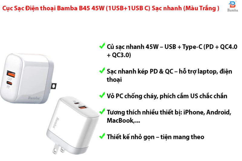 Thời gian bảo hành: 12 tháng Lỗi 1 đổi 1 • Thương hiệu: Bamba • Model: B45 -Màu sắc : Trắng, Đen – Củ Sạc nhanh Wall Charger 45W Usb+ TypeC ( PD + QC4.0 + QC3.0 ) Đặc trưng * Vỏ PC chống cháy, chống cháy, an toàn khi sử dụng * Sạc nhanh USB PD+QC kép * Công suất cao PD 45W, có thể sạc nhanh cho máy tính xách tay * Tương thích rộng rãi với điện thoại di động phổ thông , laptop… * Phích cắm chắc chắn , bền bỉ chuẩn Us