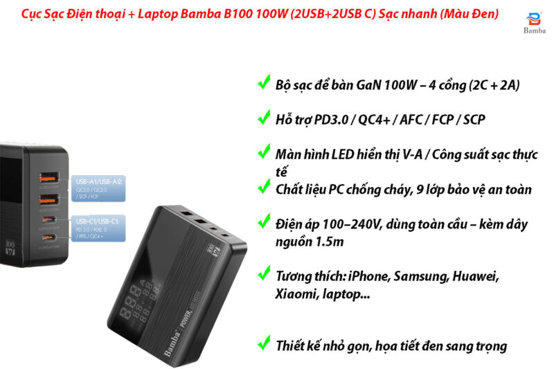 - Bộ sạc Bamba B100 hỗ trợ phương thức sạc nhanh PD3.0+QC4.0, PPS với ương thích với MacBook Pro/Air, iPad, Máy tính xách tay, iPhone, Galaxy, Pixel