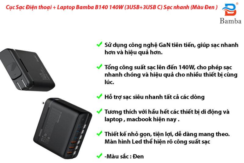 Thời gian bảo hành: 12 tháng Lỗi 1 đổi 1 • Thương hiệu: Bamba • Model: B65 -Màu sắc : Đen -Bộ sạc 2 USB C + 2 Usb với PD3.0+QC4.0. Bộ sạc nhanh PPS đa cổng Bộ sạc USB C Tương thích với MacBook Pro/Air, iPad, Máy tính xách tay, iPhone, Galaxy, Pixel ….