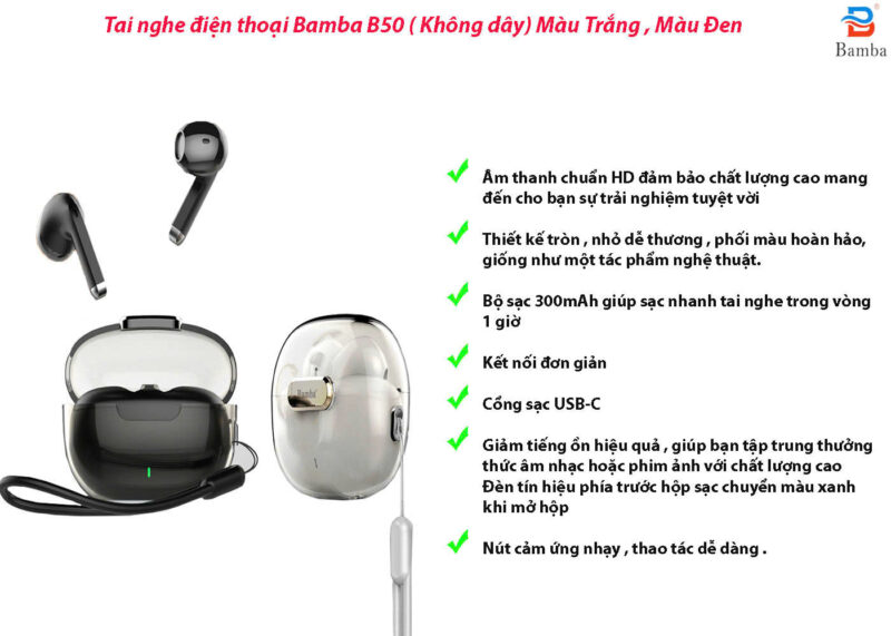 - Tai nghe Bluetooth Bamba B50 sử dụng chip tín hiệu và truyền âm thanh tốt nhất trên thị trường ,khử ồn cao cấp cùng phiên bản Bluetooth 5.3 , mang đến cho quý khách trải nghiệm tuyệt vời .