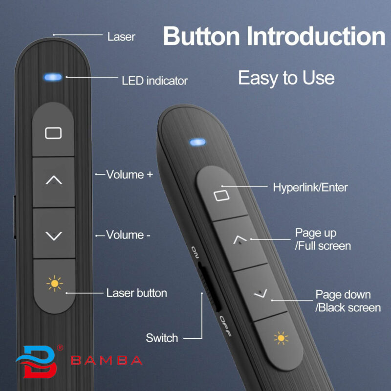Bảo Hành 12 Tháng Lỗi 1 đổi 1 Bút trình chiếu BAMBA B5 là dụng cụ không thể thiếu trong các buổi trình chiếu Slide Show, Power Point, Bản đồ, Word, Excel, Browser. Với tính năng cho phép bạn dùng điều khiển lật trang lên, xuống và dùng tia laser để nhấn mạnh các điểm chú ý trong bài thuyết trình mà không cần phải dùng đến bàn phím máy tính, chuột, que chỉ.