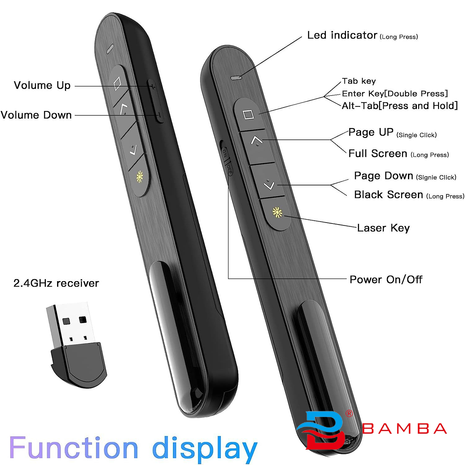 Thông số kỹ thuật: Cổng giao tiếp : USB (được gắn bên dưới bút) Kết nối : Wireless 2.4GHz Khoảng cách điều khiển từ xa : 10m Hiển thị đèn LED : Có Hiển thị đèn Laser : Có loại 3R Dung lượng pin : dùng 1 pin tiểu AAA (tặng kèm) Màu : Đen Kích thước: 139.2 * 18.2 * 19.7 mm Cân nặng: 21.7g