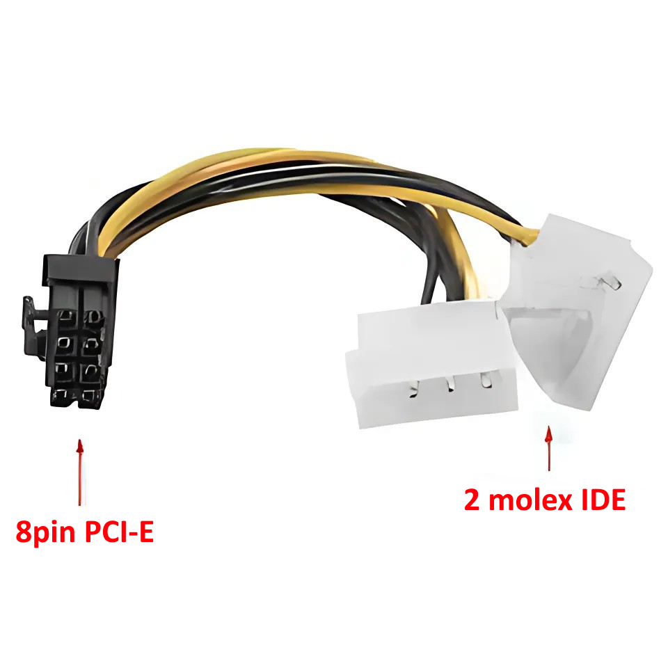 – Chuyển đổi từ 2 cổng molex IDE 4p sang 8p PCIe, cấp nguồn cho hoạt động của VGA card.