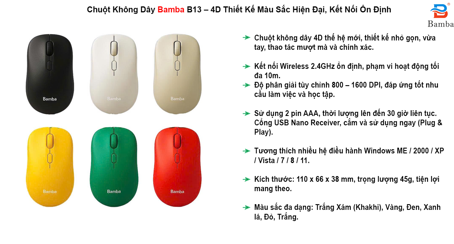 🖱 Chuột Không Dây Bamba B13 – 4D Thiết Kế Màu Sắc Hiện Đại, Kết Nối Ổn Định
