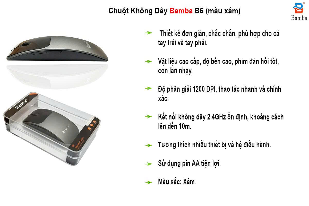 Chuột Không Dây Chuột BAMBA B6 với thiết kế thuận tiện hơn, vật liệu tốt hơn, sẽ mang lại trải nghiệm tuyệt vời.