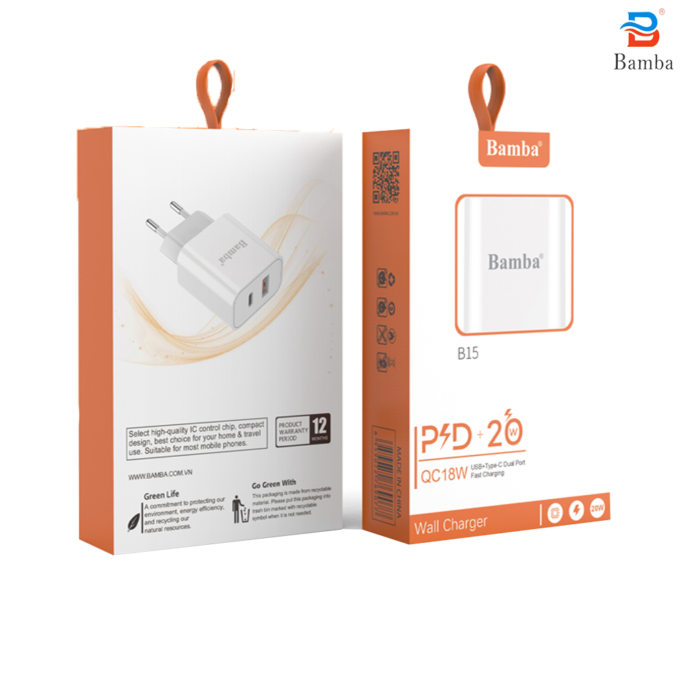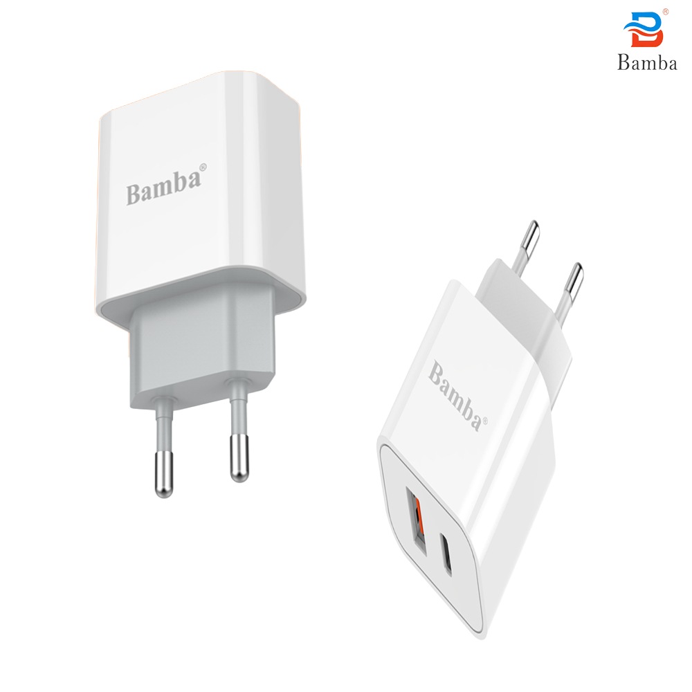 • CỐC SẠC NHANH 20W BAMBA B15 1 CỔNG USB QC18W + 1 CỔNG USB C PD 20W