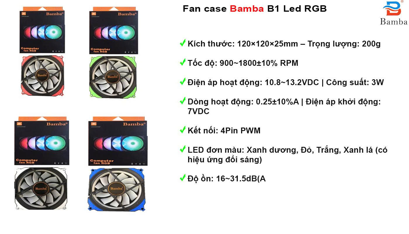 Fan case BAMBA B1 là sản phẩm quạt tản nhiệt với kích thước 12cm có hiệu ứng LED chuyên thổi làm mát và hút khí nóng cho PC của bạn với tốc độ lên đến 1.800 RPM.