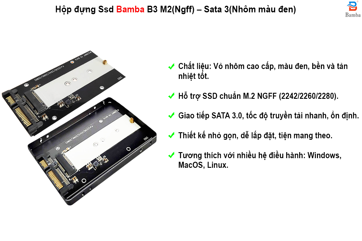 Box chuyển đổi Bamba B3 M2(Ngff) – Sata 3 giúp bạn chuyển đổi dòng ổ cứng SSD M2-sata chuẩn NGFF sang chuẩn ổ cứng 2.5 inch dùng trên máy tính bàn và laptop không có cổng