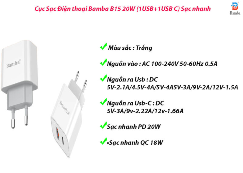 Thời gian bảo hành: 12 tháng Lỗi 1 đổi 1 • Thương hiệu : Bamba • Model : Bamba B15 • Màu sắc : Trắng • Nguồn vào : AC 100-240V 50-60Hz 0.5A • Nguồn ra Usb : DC 5V-2.1A/4.5V-4A/5V-4A5V-3A/9V-2A/12V-1.5A • Nguồn ra Usb-C : DC 5V-3A/9v-2.22A/12v-1.66A • Sạc nhanh PD 20W • Sạc nhanh QC 18W